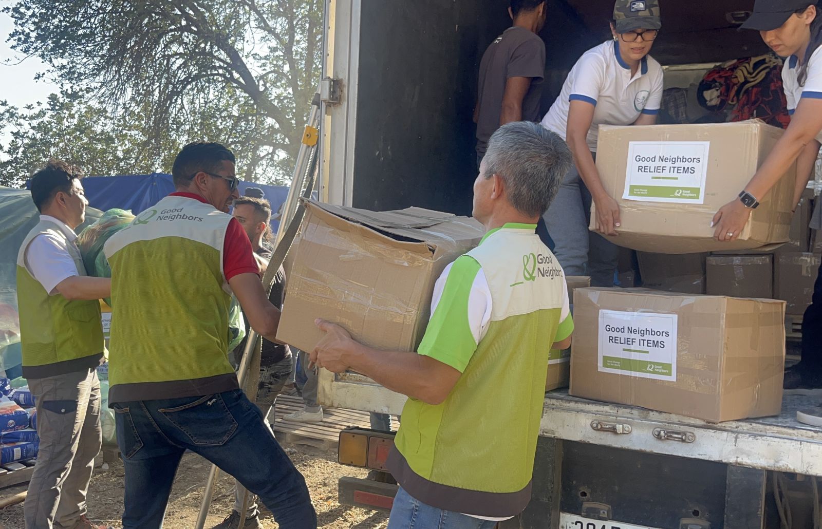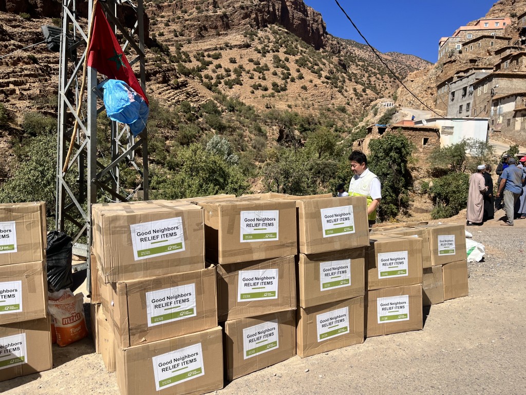 好鄰居緊急救援團隊抵達摩洛哥Casa Blanca(卡薩布蘭卡),目前已完成救援物資包裝與貼標籤的任務,並已將這些物資分發給兩個村莊(Douar Ait Tadrart, Onain Community, Taroudant.)的200戶家庭,為災民提供所需的支援和協助。